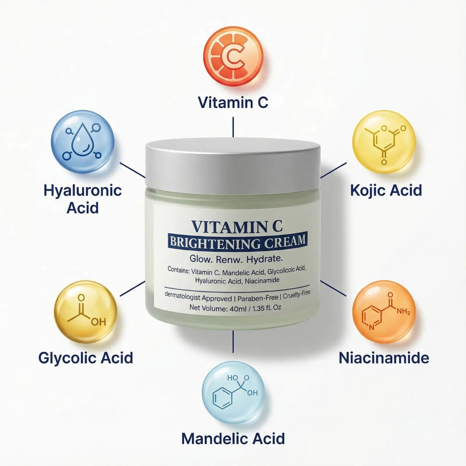 A dermatologist-approved brightening cream designed to target dark spots, uneven skin tone, and dull texture — with powerful yet gentle ingredients for all skin types, including sensitive and oily skin.